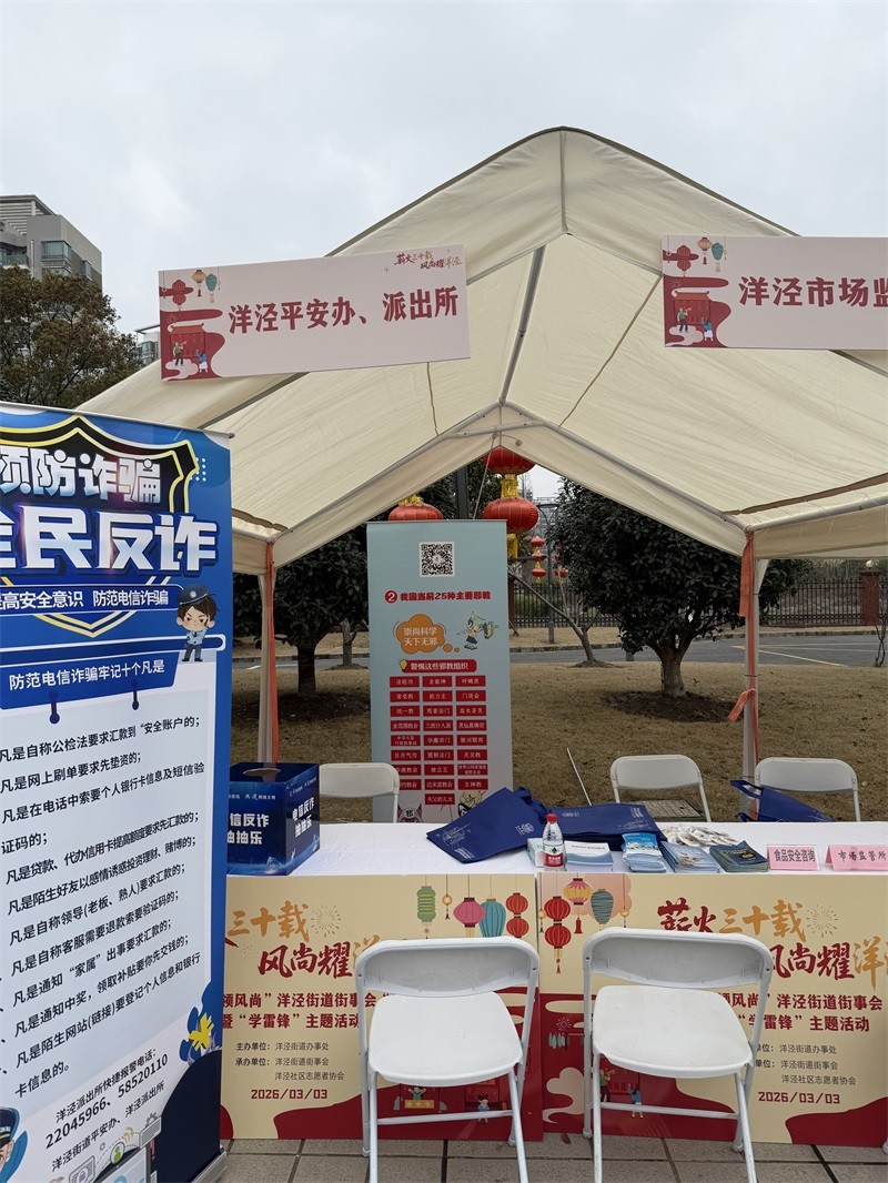 2026年3月3日上午,洋泾街道平安办结合学雷锋纪念日,在洋泾社区文化活动中心开展反邪教宣传活动。活动以现场摊位形式向居民普及反邪教知识,引导大家崇尚科学、远离邪教,并赠送反邪宣传礼品。现场吸引200余名居民、学生参与,进一步增强群众防范邪教意识,营造文明和谐、平安稳定的社区氛围。